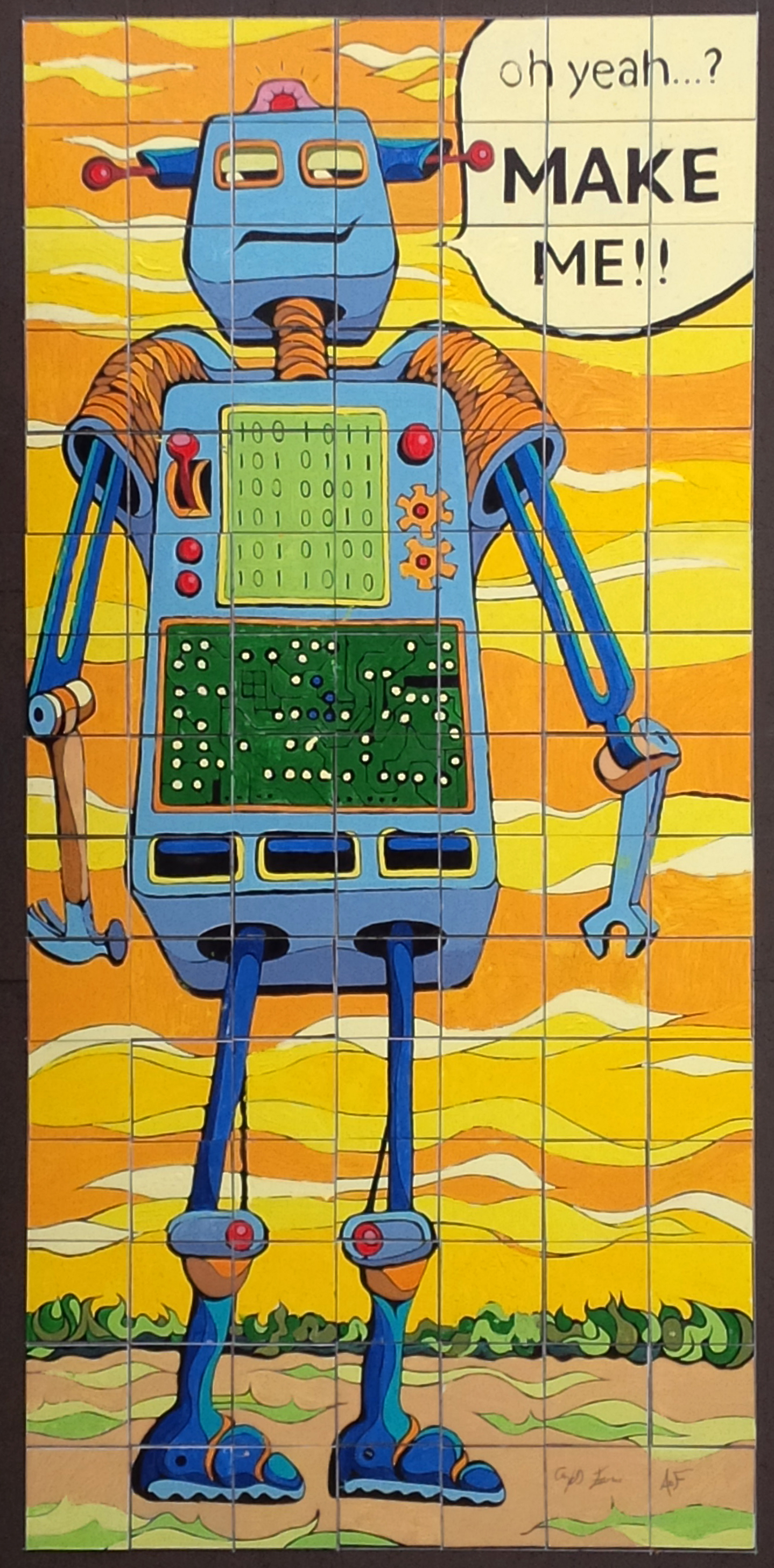 The design of the robot was a collaborative effort between myself and my Marco. Who can resist a good old-fashioned robot! This robot’s name is KWARTZ-Bot in honour of KWARZ Lab, and he’s somewhat taunting everyone to MAKE stuff! The 1’s and 0’s spell out ‘KWARZ’ in binary code. There are 3 giant USB ports just above the legs, and a circuit board mid-section – just in case it’s not apparent from the picture.