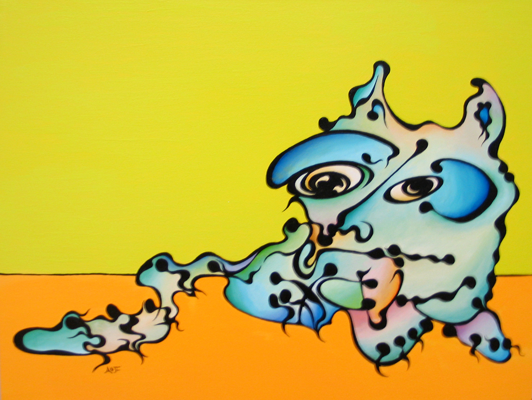 All of these decisions are guided by the overall message that seems to want to be expressed by the image. Yes. The image and I are having a type of conversation. I’ll make a change; the image feels good. I’ll make another change; the image groans; and I revise until the groaning ceases. I’ll make a change; the image eggs me on. It can feel like the image is really in control, which I accept. I exist to serve the image so it can attain its peak expressiveness. Through all of this, I have a set of constraints that are bound by my personal style, which has evolved through 20+ years of painting. The image that comes to me, therefore, is accepting and expecting versions of these constraints. My style constraints usually include: definite organic, expressive lines; sensuous shaded shapes (I call these shape characters); and an un-ambivalent, bold use of color. The more attuned I am to the image, the more effective my painting.